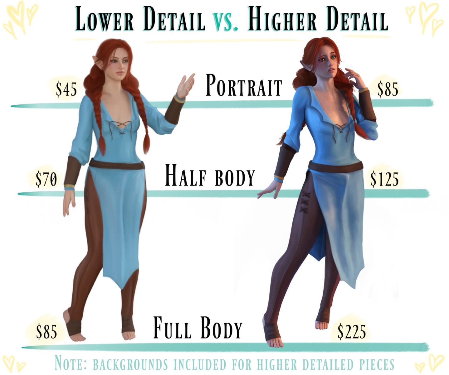 The type of commission you’re interested in (such as a portrait, full body, SFW or NSFW, etc.) and the level of detail.The character, or characters, you would like portrayed. This includes name(s), personality, and visual references if they are an OC.Any social medias of yours that you are okay with me linking to (such as your Twitter, Tumblr, etc.) when I post the finished piece on my social media. If this is to be a private commission, please let me know ahead of time! Otherwise, I hold the right to publish the work, as per my Terms of Service.Your PayPal email or payment info (see Terms of Service for more details.)Any other details you think would be pertinent to your commission. Is it a shipping commission where the two characters have an inside joke in their romance? Does your OC has a favorite treat? Anything at all that you want me to know, please feel free to do so! And always, always* ask questions if you have them. Answering them is what I am here for.